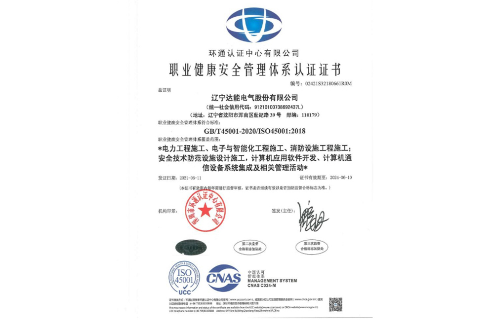 职业健康安全管理体系认证证书