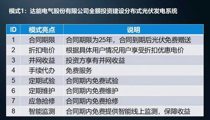 达能电气提供两种光伏发电合作模式,可选择企业自建及合同能源管理模式。企业采用自投模式,在发电全消纳的情况下,约3-4年左右时间回本,电站可连续发电25年,发电收益有保证。企业也可采用合同能源管理模式,由第三方进行投资建设,减少一次性投资支出,电站发电优先供企业使用,比享受8.5-9折目录电费优惠。