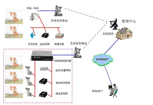 随着“创建百年油田”、“建设数字油田”目标的确立,为了配合油田产能建设,开发油田生产数据自动采集及生产现场远程视频监控功能,油田通信公司对油田现有生产设备进行信息化改造,建设一套集油田视频监控及数据传输为一体的油田数字化综合业务系统。该系统可以大大提升生产系统自动化管理水平,提高油田采收率、增加原油产量、降低劳动强度、节约企业运行成本、保证工人人身安全、从而提高企业核心竞争力。 该系统将油井、计量间、中转站、联合站等站点的视频监控信息数据集中起来,通过有线、无线或有线、无线混合的IP网络,与采油厂现有的计算机网络相连接,实现对生产现场的实时监控和生产设备的远程测控。最终,实现对现有人力资源的合理调配和对整个生产过程的自动化管理。